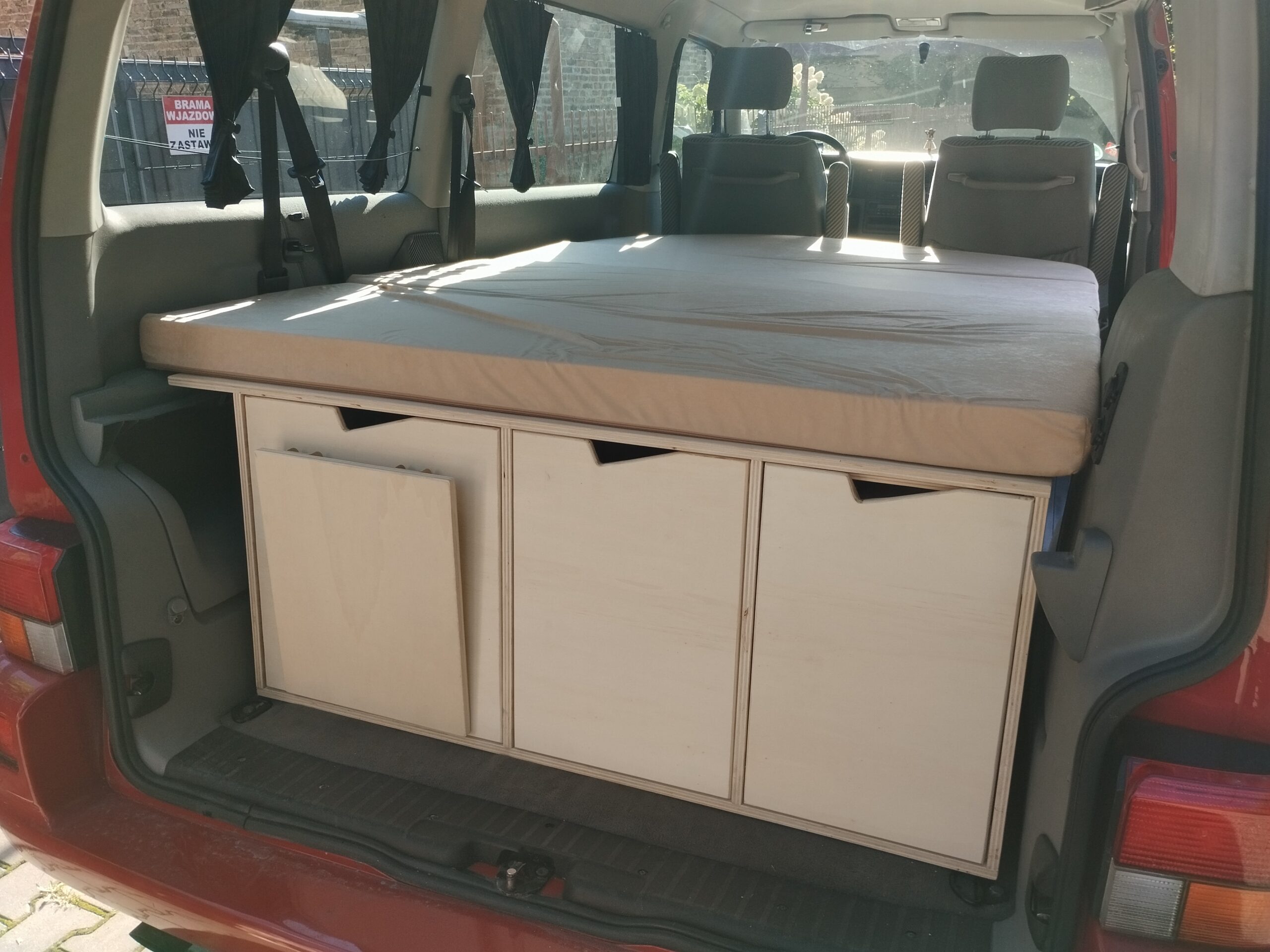 Nasza druga specjalność to kompleksowa zabudowa kampervanów – od projektu po realizację wraz z pełnym wyposażeniem.